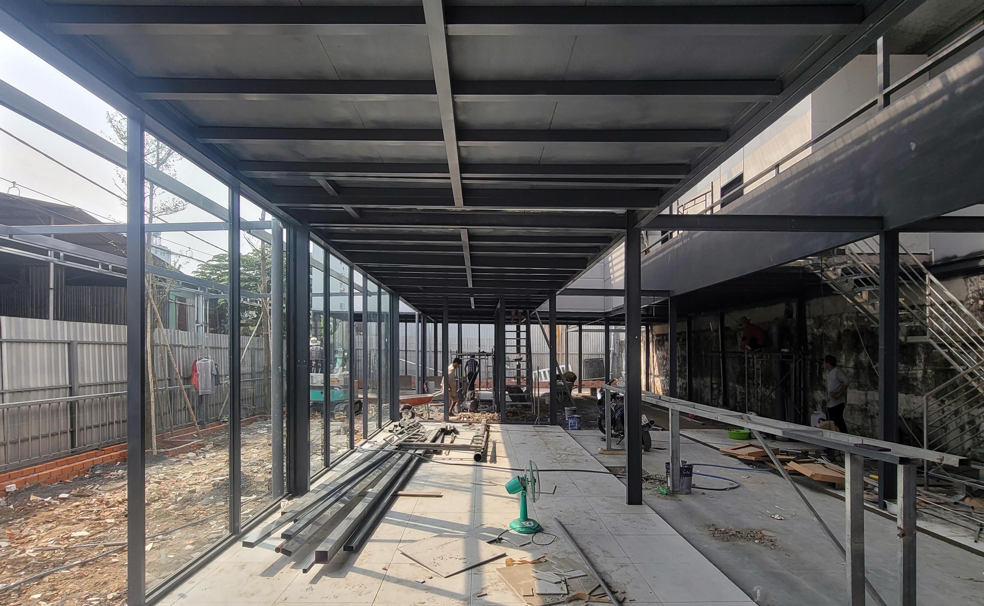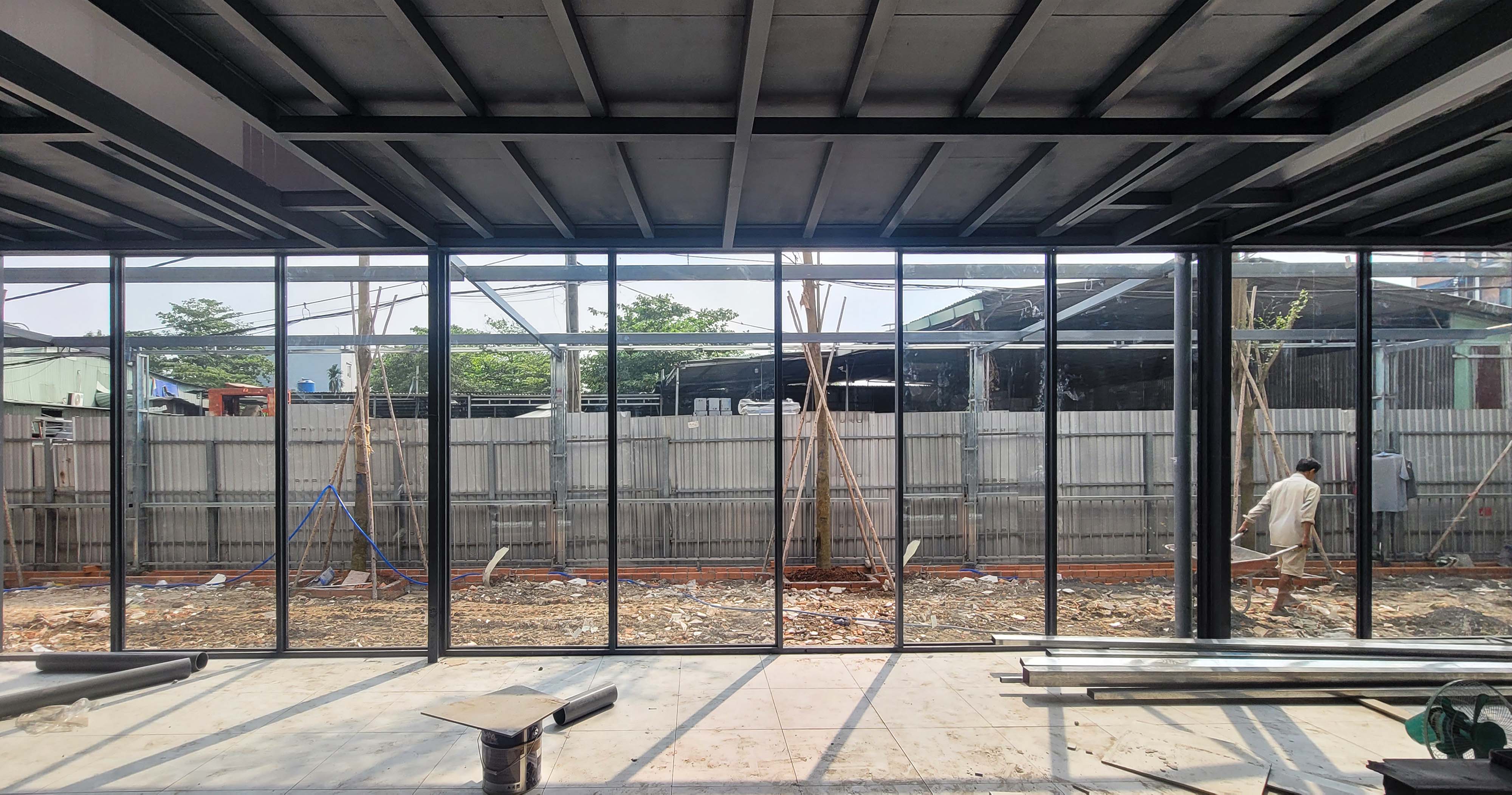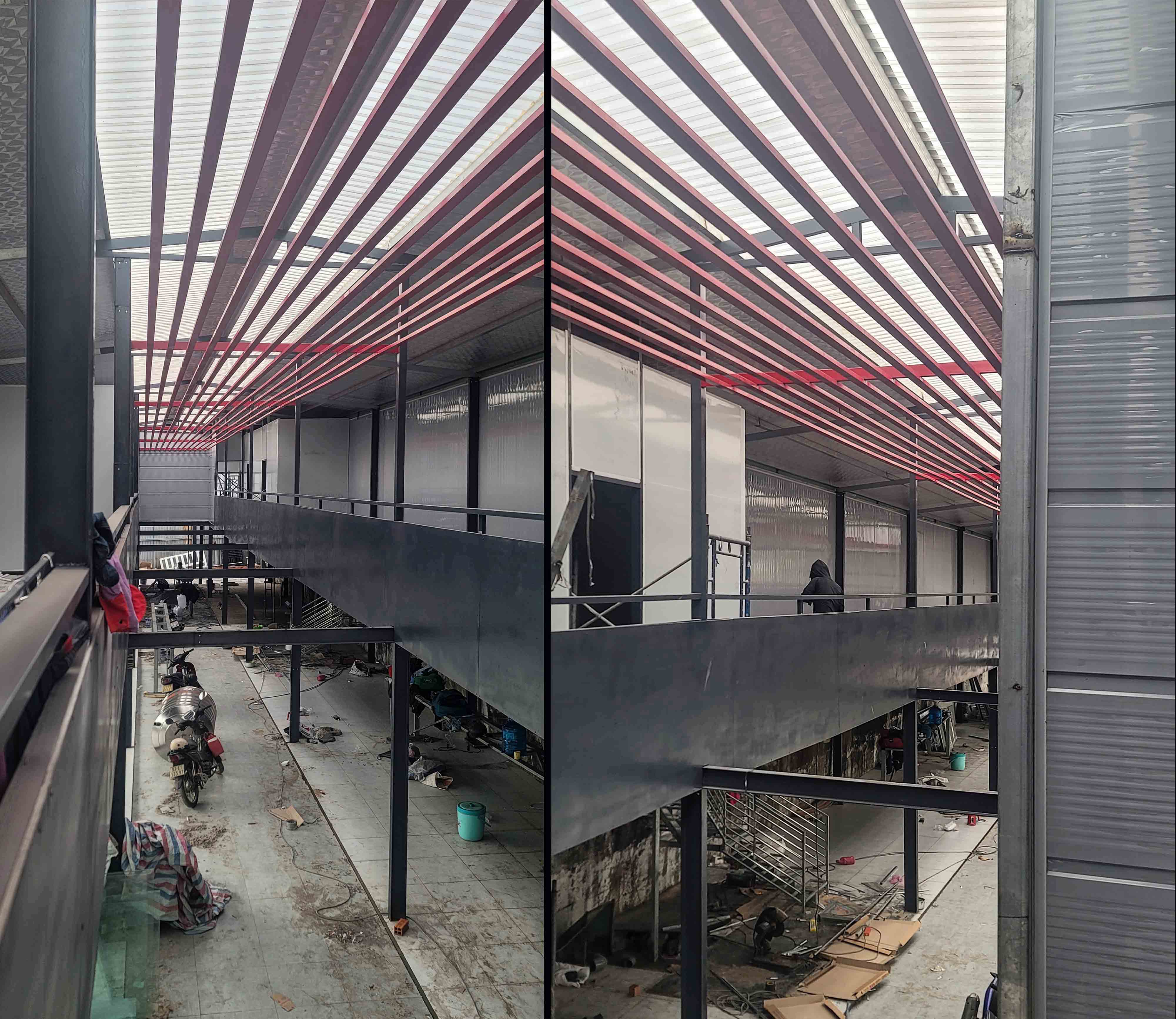 Hệ mái lấy sáng điểm nhấn: Chi tiết ấn tượng nhất chính là hệ thống mái kính lấy sáng (skylight) chạy dọc suốt chiều dài công trình. Các khung kết cấu thép đỡ mái được sơn màu đỏ rực rỡ, không chỉ đóng vai trò chịu lực mà còn tạo nên nhịp điệu thị giác (visual rhythm) dẫn hướng mắt nhìn sâu vào bên trong. Ánh sáng tự nhiên từ đây đổ xuống kết hợp với sàn bê tông mài bóng (polished concrete) tạo nên hiệu ứng phản xạ ánh sáng, giúp không gian có cảm giác rộng và thoáng đãng hơn nhiều so với diện tích thực.
