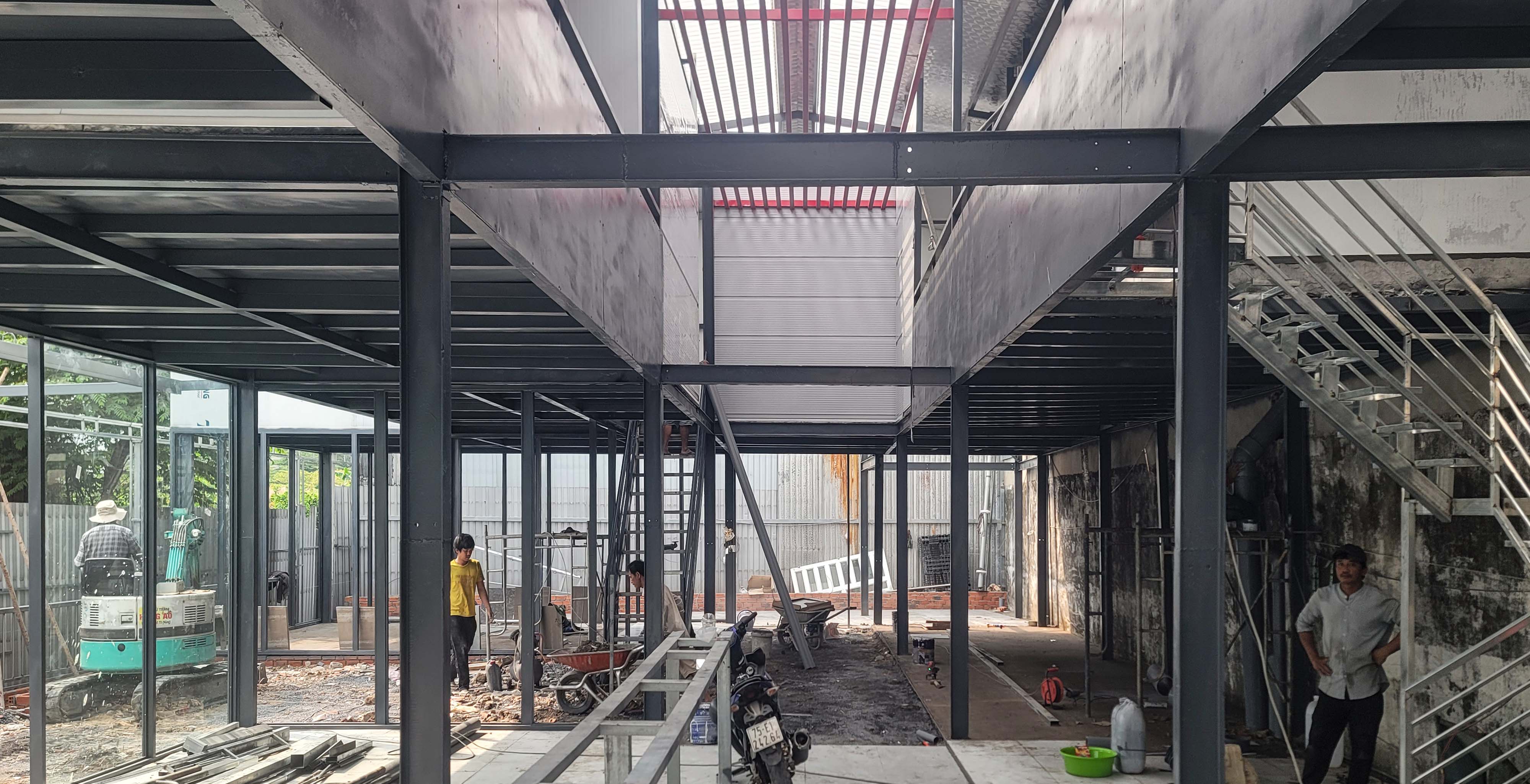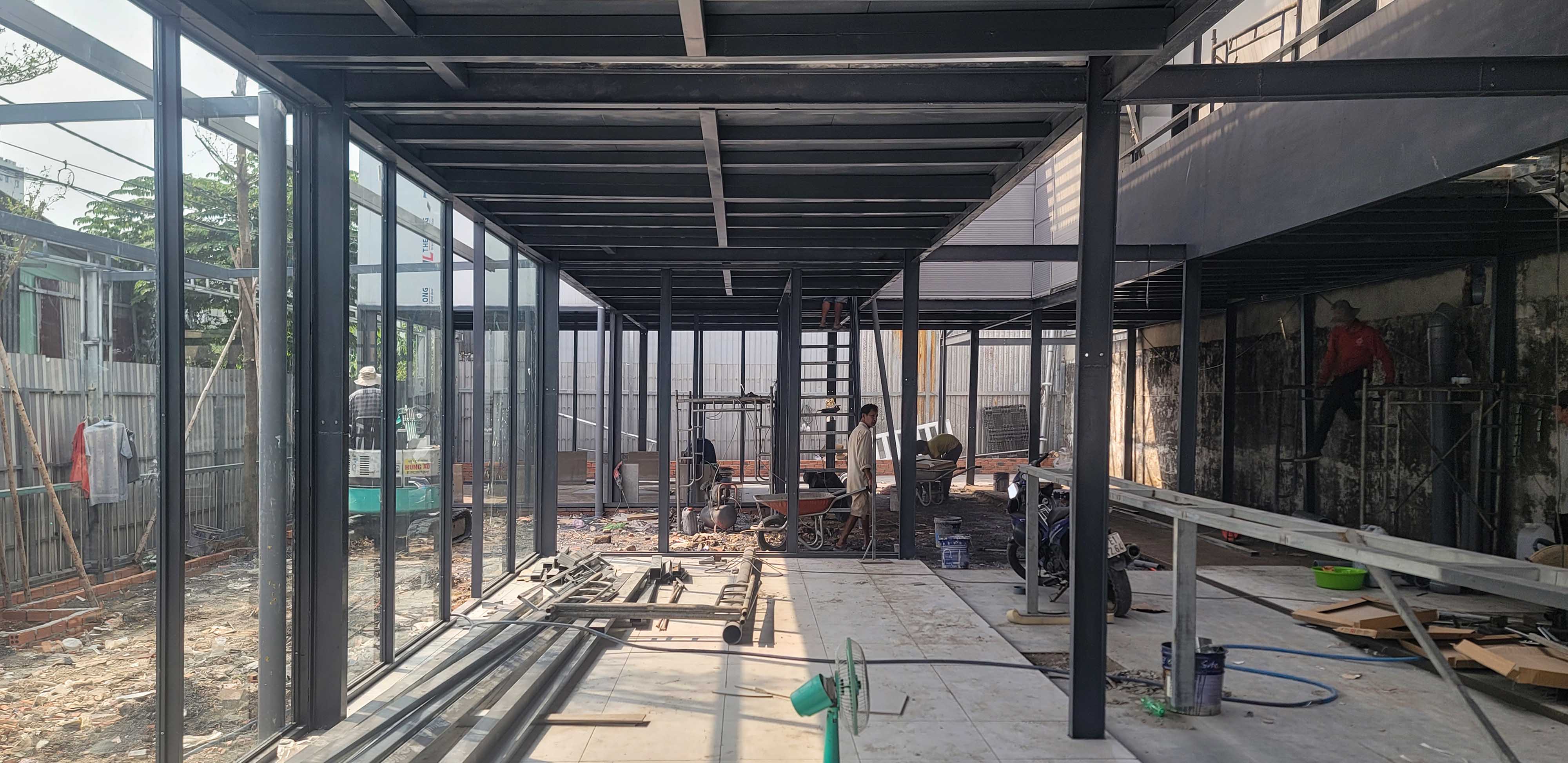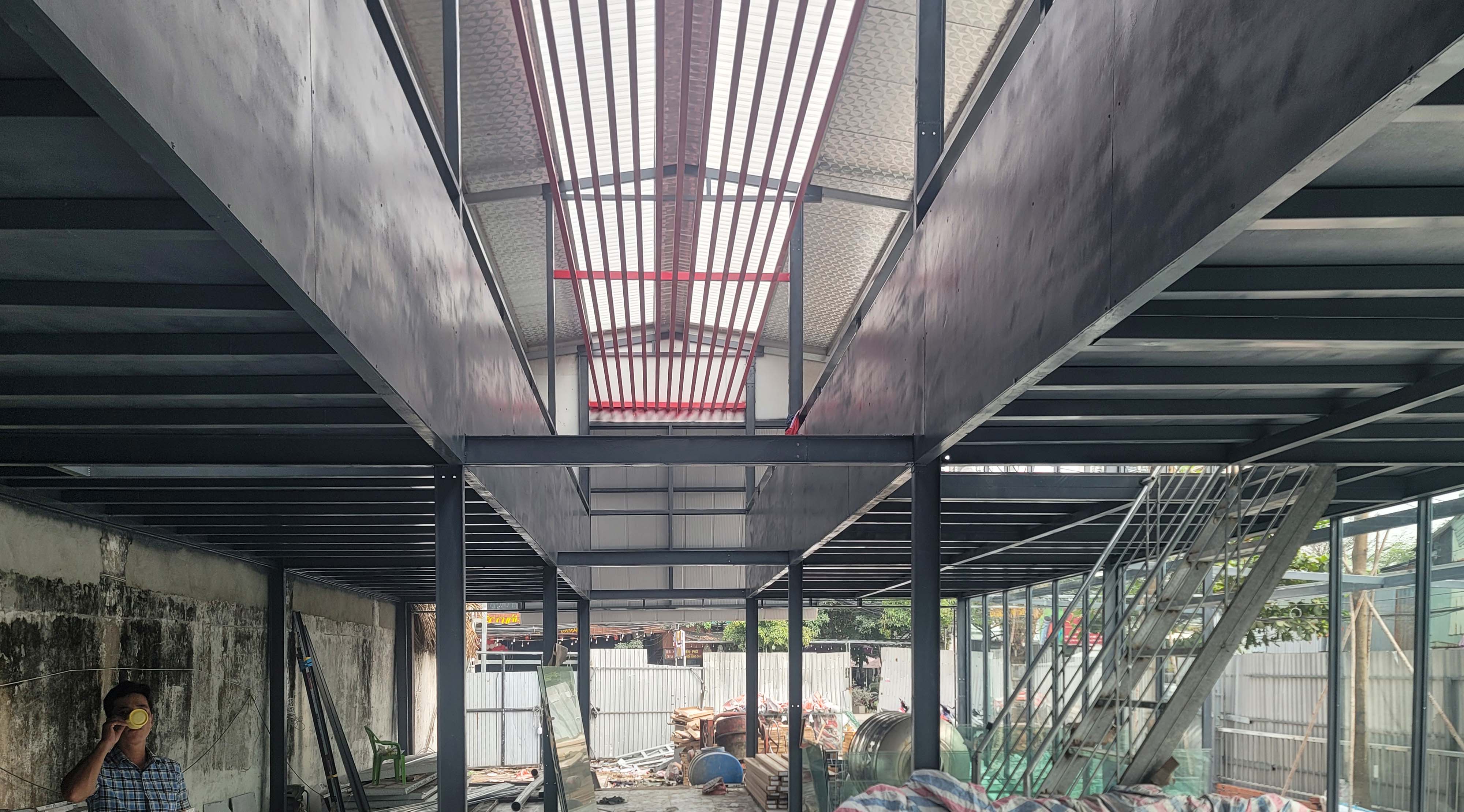 Hệ mái lấy sáng điểm nhấn: Chi tiết ấn tượng nhất chính là hệ thống mái kính lấy sáng (skylight) chạy dọc suốt chiều dài công trình. Các khung kết cấu thép đỡ mái được sơn màu đỏ rực rỡ, không chỉ đóng vai trò chịu lực mà còn tạo nên nhịp điệu thị giác (visual rhythm) dẫn hướng mắt nhìn sâu vào bên trong. Ánh sáng tự nhiên từ đây đổ xuống kết hợp với sàn bê tông mài bóng (polished concrete) tạo nên hiệu ứng phản xạ ánh sáng, giúp không gian có cảm giác rộng và thoáng đãng hơn nhiều so với diện tích thực.