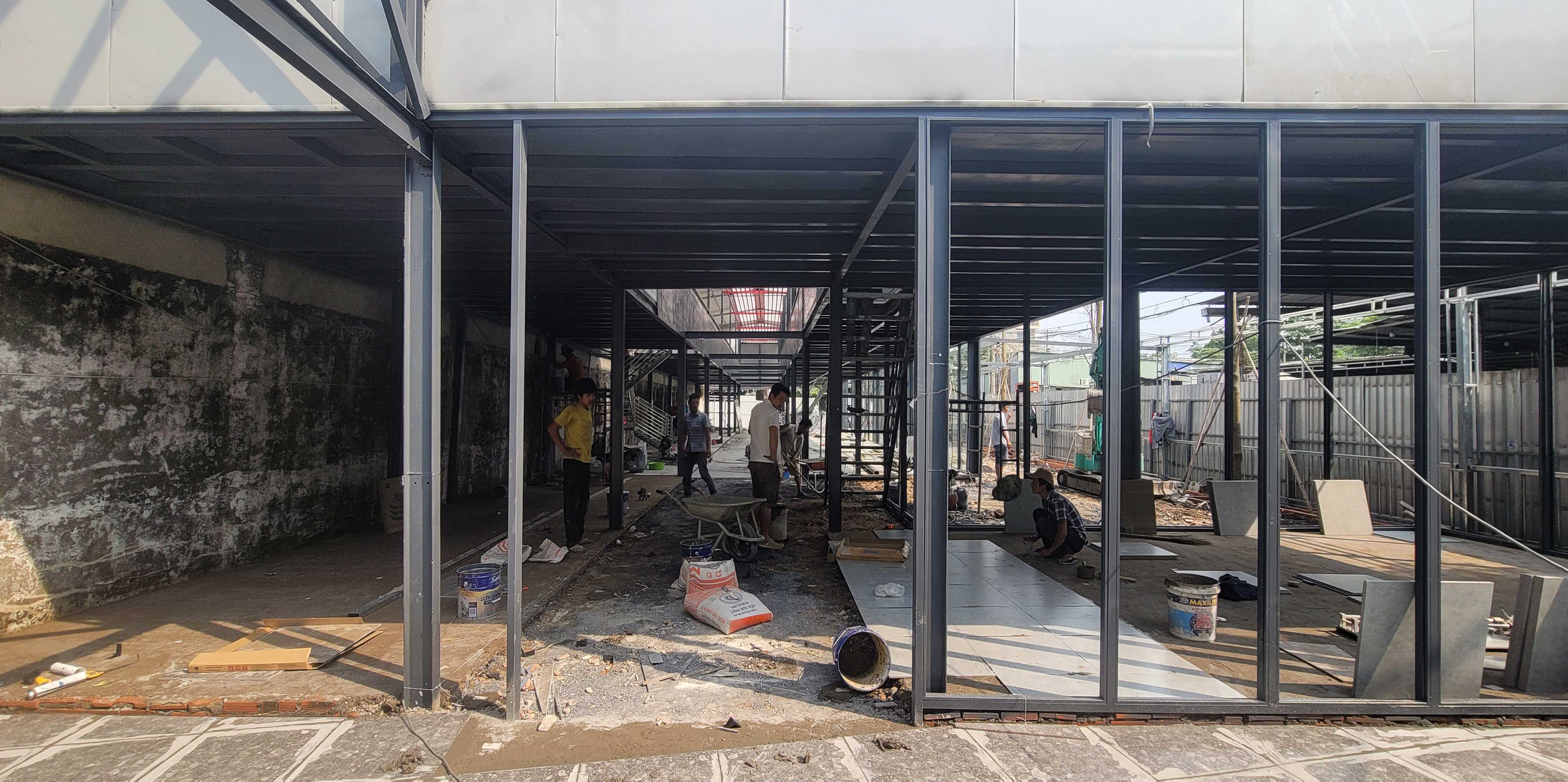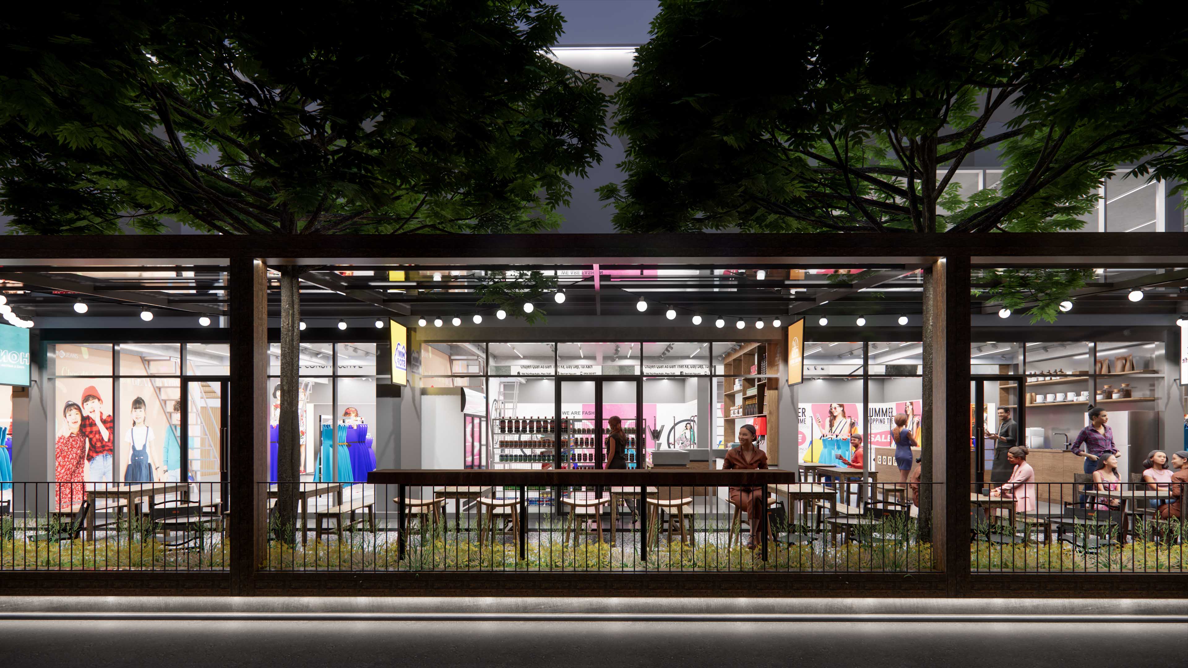 Kiến trúc chuyển tiếp (Transitional Architecture): Khu vực bán lộ thiên này được định hình bởi hệ khung thép sơn giả gỗ hoặc màu tối, tạo thành các module nhịp điệu đều đặn. Hệ khung này không chỉ đóng vai trò kết cấu cho mái che kính/lam chắn nắng mà còn định hình không gian ngồi cafe vỉa hè (sidewalk cafe culture) nhưng ở một đẳng cấp quy hoạch gọn gàng và sang trọng hơn.