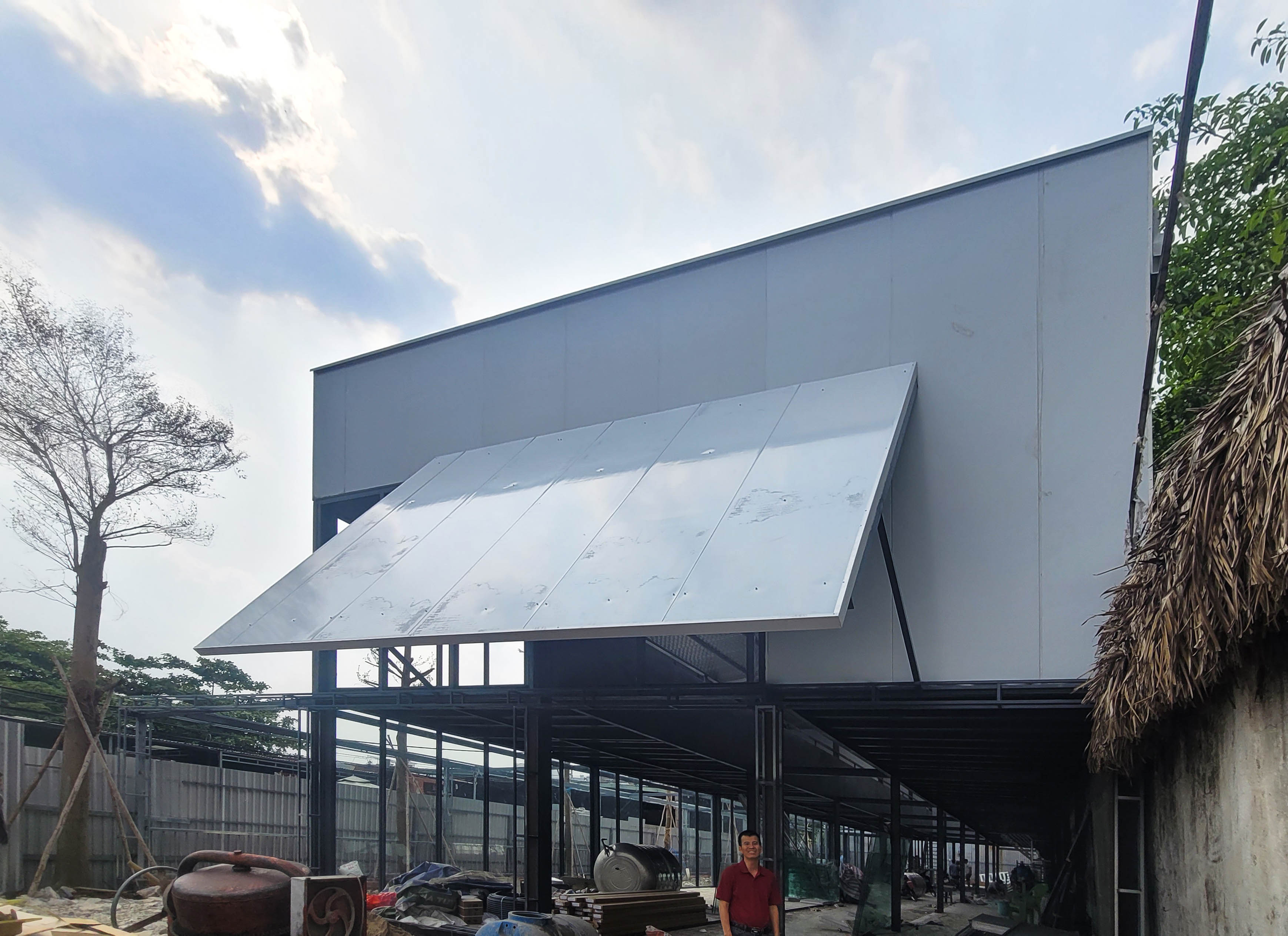 Điểm nhấn kỹ thuật đáng chú ý nhất ở góc độ này chính là giải pháp "Roofscape" (cảnh quan mái). Khác với vẻ ngoài vuông vức của mặt tiền, phần mái chính của công trình trải dài theo phương dọc (linear layout) với dải lấy sáng (hoặc khe thoáng nhiệt) chạy suốt chiều dài đỉnh mái. Chi tiết này cho thấy kiến trúc sư đã tính toán kỹ lưỡng bài toán vi khí hậu: dải lấy sáng này vừa đóng vai trò như một "giếng trời" khổng lồ đưa ánh sáng tự nhiên vào sâu bên trong lõi công trình vào ban ngày, vừa biến toàn bộ tòa nhà thành một "hộp đèn" rực rỡ, nổi bật giữa nền tối của khu dân cư bao quanh vào ban đêm.