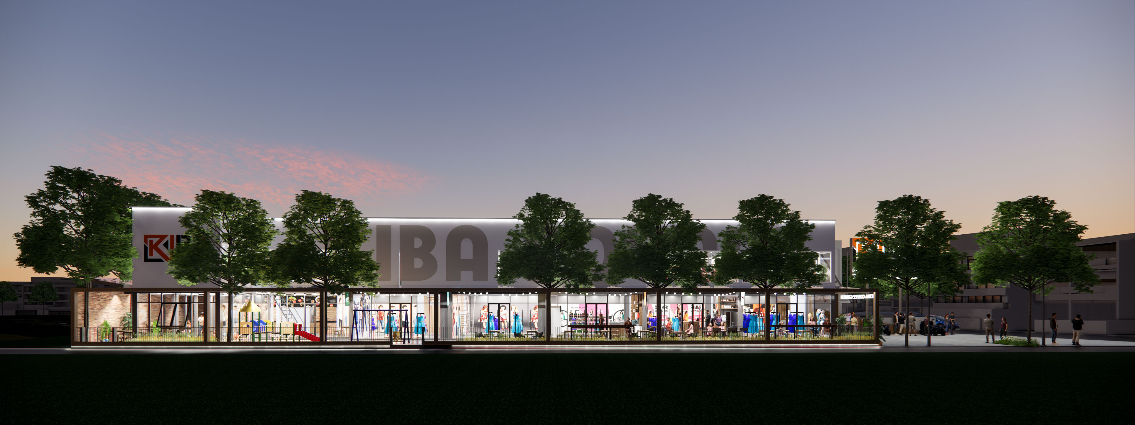 Bên cạnh khối thương mại, kiến trúc sư đã khéo léo lồng ghép mảng xanh và không gian thư giãn với khu vực "KIBA COFFEE GARDEN" nằm ở phía bên trái. Khu vực này sử dụng kết cấu bán lộ thiên với mái che lam gỗ hoặc kim loại, kết hợp cùng những tán cây xanh lớn tạo bóng mát tự nhiên. Sự hiện diện của cây xanh không chỉ làm mềm đi các đường nét bê tông, kính và thép mà còn giúp điều hòa vi khí hậu cho khu vực sân trung tâm.