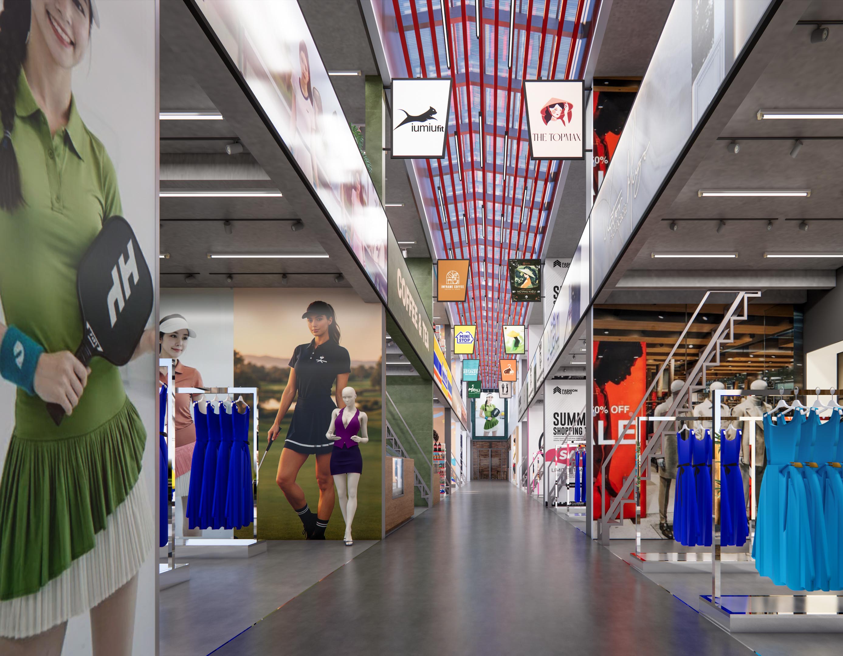 Trục giao thông "xương sống" mạnh mẽ: Không gian được tổ chức quanh một trục hành lang trung tâm thẳng tắp, đóng vai trò như "xương sống" kết nối toàn bộ các gian hàng. Giải pháp này giúp tối ưu hóa luồng di chuyển (customer flow), đảm bảo khách hàng có thể tiếp cận mọi cửa hàng từ ngay lối vào chính mà không gặp vật cản thị giác.