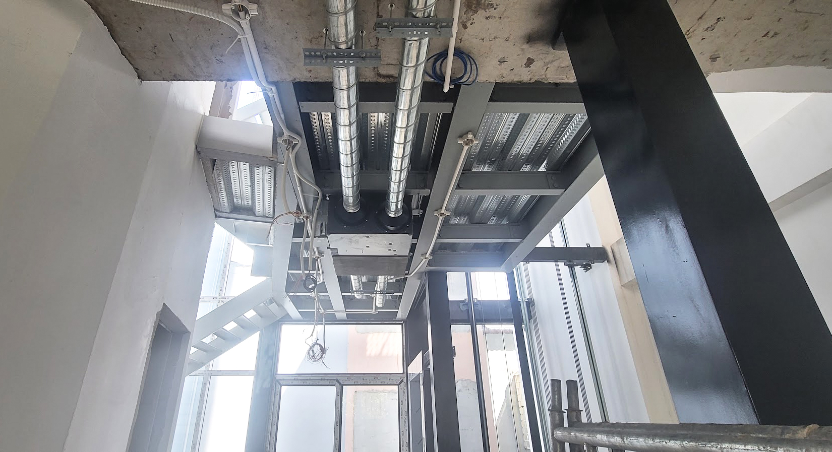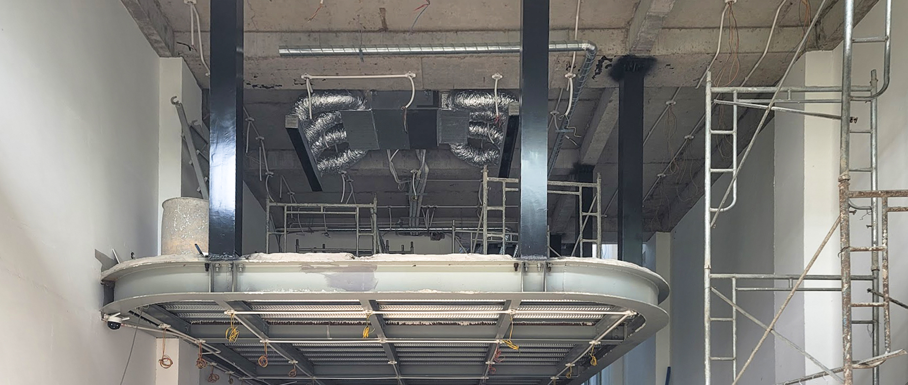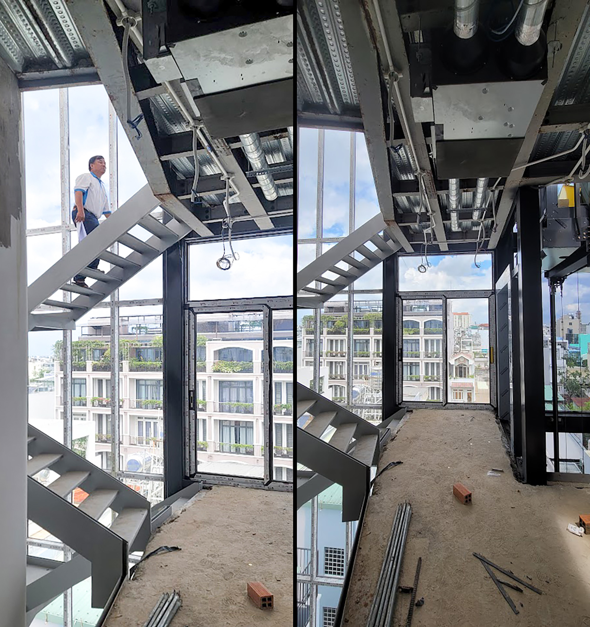 Hình ảnh thi công tầng lững với kết cấu treo độc đáo giúp không gian tầng trệt được nhẹ nhàng và thông thoáng 03.2025, © DATAA