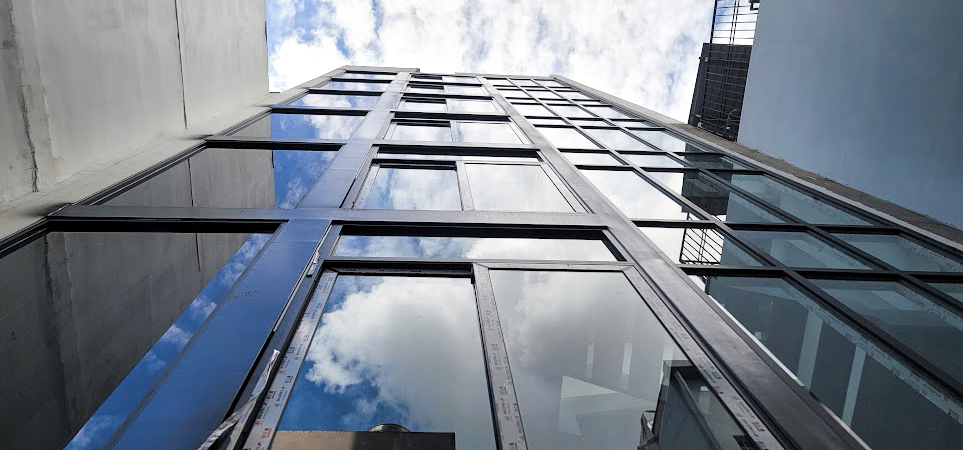 Toàn bộ vách mặt tiền là vách kính không khung nhằm tạo nên không gian mở tối đa cho nội thất. Không gian văn phòng kết nối với ban công, hệ lam và cây xanh tạo nên một sự cở mở và hài hòa.
